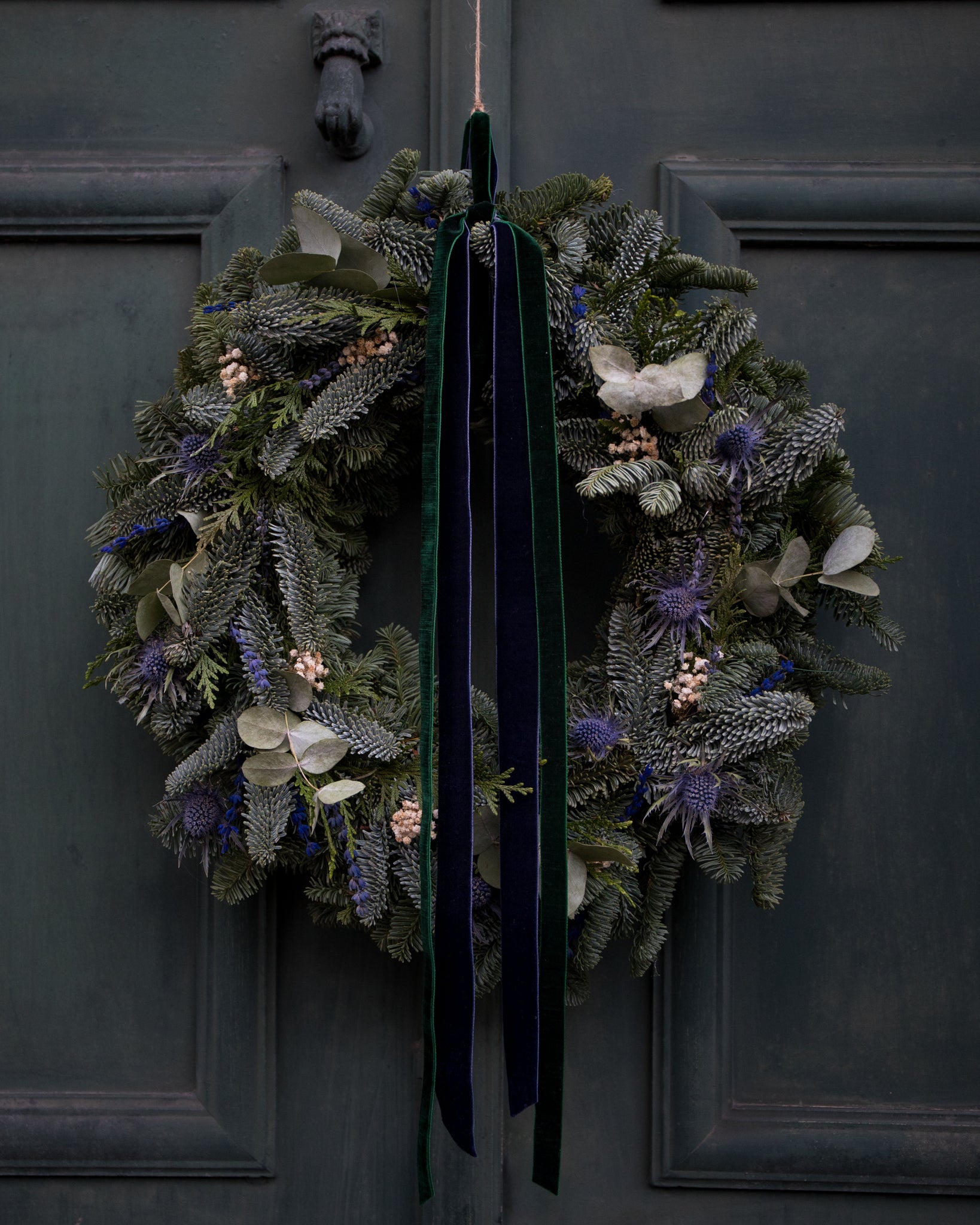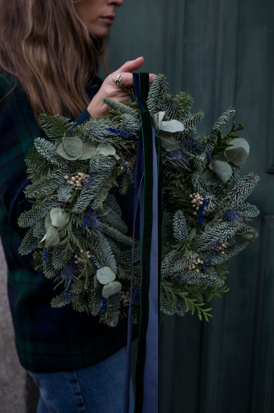 Na Blomster by Pi surge uma coroa nunca antes criada: uma coroa de Natal em tons de azul e verde. Sobre a base de pinheiro nórdico fresco, eucalipto e cedros, juntam-se cardos azuis, a alfazema e vivaz preservado.